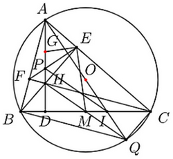 2) Cho tam giác \(ABC\) nhọn nội tiếp đường tròn \(\left( O \right)\), các đường cao \(AD,\,\,BE,\,\,CF\) cắt nhau tại \(H\). Kẻ đường kính \(AQ\) của đường tròn \(\left( O \right)\) cắt cạnh \(BC\) tại \(I\).