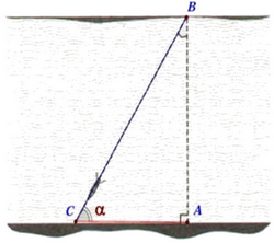 1) Một khúc sông rộng khoảng 157m. Một con tàu mất 5 phút để đi từ vị trí B (bờ bên này) đến vị trí C (bờ bên kia). Tàu đi với vận tốc 2km/h (tính cả vận tốc thật của tàu và vận tốc dòng nước) và bị dòng nước đẩy lệch đi một góc \(\alpha \) như hình vẽ. Tính góc \(\alpha \) (kết quả làm tròn đến độ).
