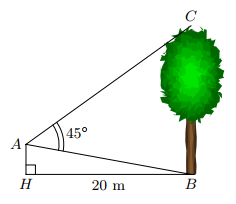 Biết \(A H=4(\mathrm{~m}), H B=20(\mathrm{~m}), \widehat{B A C}=45^{\circ}\). Khi đó chiều cao của cây là (tính chính xác đến hàng phần chục)