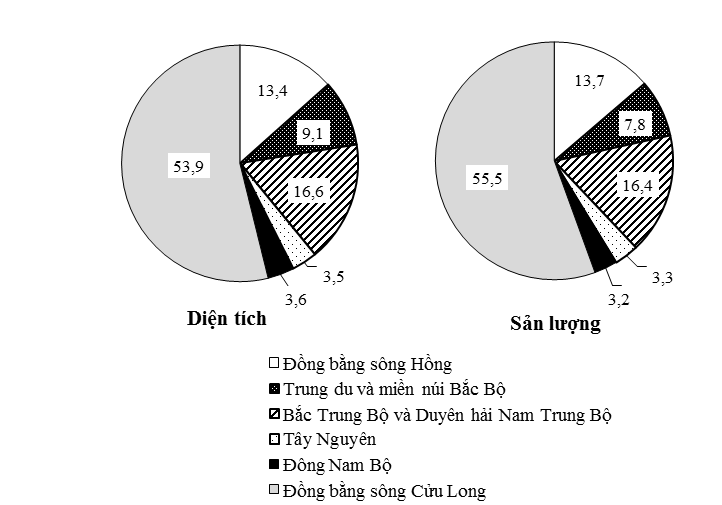 Cho biểu đồ: Cơ cấu diện tích và sản lượng lúa phân theo vùng của nước ta năm 2021 (Đơn