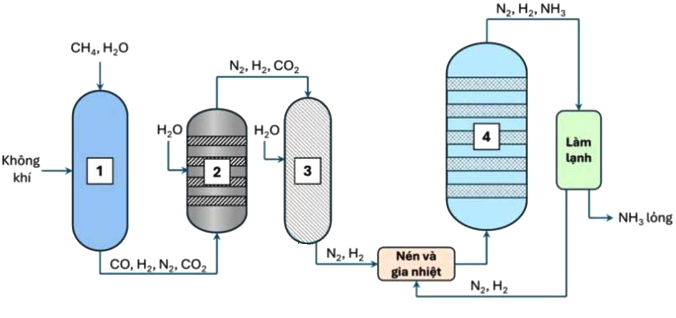 Nghiên cứu cho thấy tỉ lệ thể tích N2 và H2 tối ưu là 1 : 3. Nếu lấy 1000 m3 không khí (chứa 21,03% O2; 78,02% N2, còn lại là khí hiếm theo thể tích), thì thể tích (m3) khí methane và hơi nước cần lấy để có đủ lượng N2 và H2 đưa vào tháp tổng hợp ammonia lần lượt là bao nhiêu?. Giả thiết các phản ứng (2), (3) và (4) đều xảy ra hoàn toàn và các thể tích khí đo ở điều kiện.