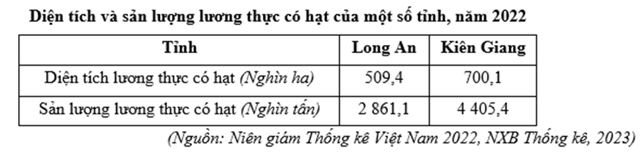 Căn cứ vào bảng số liệu trên, hãy cho biết năng suất lương thực có hạt của tỉnh Long An thấp hơn năng suất của tỉnh Kiên Giang bao nhiêu tạ/ha? (làm tròn kết quả đến một chữ số thập phân)