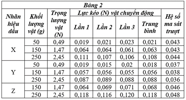 | a) Nhãn hiệu dầu X sẽ tạo ra hệ số ma sát lớn nhất | ||