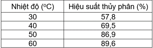 Để sản xuất glucose bằng phương pháp sinh học, bột khoai lang được hòa với nước (chỉnh pH của dịch về 4,2), hàm lượng bột khoai là 20% khối lượng. Chế phẩm thương mại Stargen 002 (chứa hệ enzyme amylase phân giải tinh bột thành đường) được bổ sung với hàm lượng 1,5 mL/kg bột khoai, rồi tiến hành phản ứng thủy phân ở các nhiệt độ khác nhau là 30, 40, 50 và 55 °C. Ảnh hưởng của nhiệt độ phản ứng đến hiệu suất thủy phân được trình bày trong bảng 1.