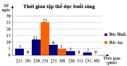 Biểu đồ dưới đây thống kê thời gian tập thể dục buổi sáng mỗi ngày trong tháng 9/2022 của bác Bình và bác An như sau: