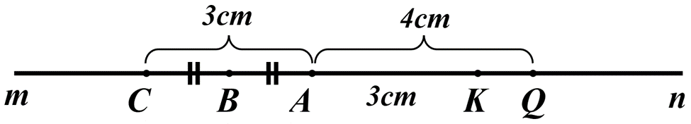 Trên tia \(An\) lấy 2 điểm \(K\) và \(Q\) sao cho \(AK = 3\;cm,AQ = 4\;cm.\) Lấy điểm \(C\) trên tia \(Am\) là tia đối của tia \(An\) sao cho \(AC = 3\;cm.\) Lấy điểm \(B\) là trung điểm của đoạn thẳng \(CA.\)