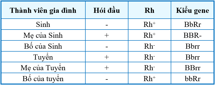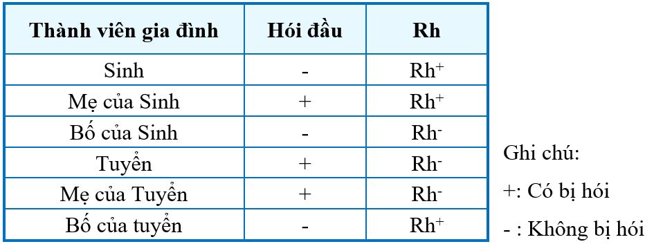 Ở người, gene quy định tính trạng hói đầu bị ảnh hưởng đồng thời bởi giới tính bởi giới tính. Phụ nữ có kiểu gene BB sẽ quy định tính trạng bị hói, tuy nhiên phụ nữ Bb và bb thì không bị hói. Ở đàn ông có kiểu gene BB và Bb sẽ quy định tính trạng hói đầu, đàn ông bb thì không. Yếu tố Rh do gene R quy định, kiểu gene của người Rh- là rr và của người Rh+ là RR hoặc Rr. Khi một người phụ nữ Rh- mang thai nhi có Rh+, hệ miễn dịch của người phụ nữ có thể tạo ra các kháng thể kháng lại Rh+ của thai nhi trong lần mang thai thứ hai, có thể dẫn đến cái chết của thai nhi. Hiện tượng này được gọi là sự không tương thích Rh. Hai gene này cùng nằm trên một cặp nhiễm sắc thể thường và cách nhau 20cM. Hai vợ chồng Sinh và Tuyển đến một văn phòng tư vấn di truyền và được bác sĩ thu thập dữ liệu như tóm tắt trong bảng dưới đây