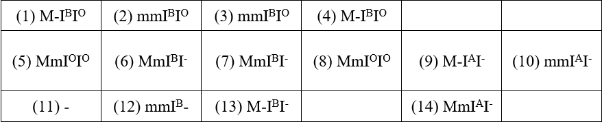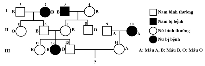 Sơ đồ phả hệ sau mô tả sự di truyền nhóm máu hệ ABO và một bệnh M ở người do 2 lôcut thuộc 2 cặp NST khác nhau quy định. Biết bệnh M trong phả hệ là do một trong 2 allele có quan hệ trội lặn hoàn toàn của một gene quy định; quần thể này đang ở trạng thái cân bằng di truyền về tính trạng nhóm máu trong đó 4% số người có nhóm máu O và 21% số người có nhóm máu B.