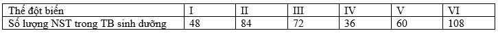 Một loài thực vật lưỡng bội có 2n = 24. Giả sử có 6 thể đột biến của loài này được kí hiệu từ I đến VI có số lượng NST trong mỗi tế bào sinh dưỡng như sau.