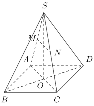 Cho hình chóp tứ giác \(S.ABCD\). Gọi \(M\) và \(N\) lần lượt là trung điểm của \(SA\) và \(SC\,.\)