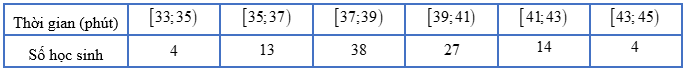Cho mẫu số liệu ghép nhóm về thống kê thời gian hoàn thành (phút) một bài kiểm tra trực tuyến của \(100\) học sinh, ta có bảng số liệu sau: