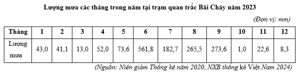 Căn cứ vào bảng số liệu trên, hãy cho biết lượng mưa trung bình năm tại Bãi Cháy năm 2023 là bao nhiêu mm (làm tròn kết quả đến hàng đơn vị).