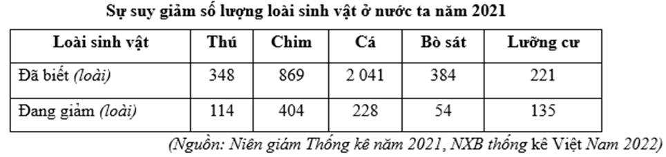 Căn cứ vào bảng số liệu trên, hãy cho biết loài sinh vật có số lượng giảm nhiều nhất so với loài sinh vật có số lượng giảm ít nhất chênh lệch nhau bao nhiêu loài đang giảm?