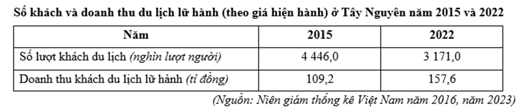 Căn cứ vào bảng số liệu, hãy cho biết chi tiêu bình quân của một lượt khách du lịch ở Tây Nguyên năm 2022 tăng bao nhiêu lần so với năm 2015 (làm tròn kết quả đến hai chữ số thập phân)
