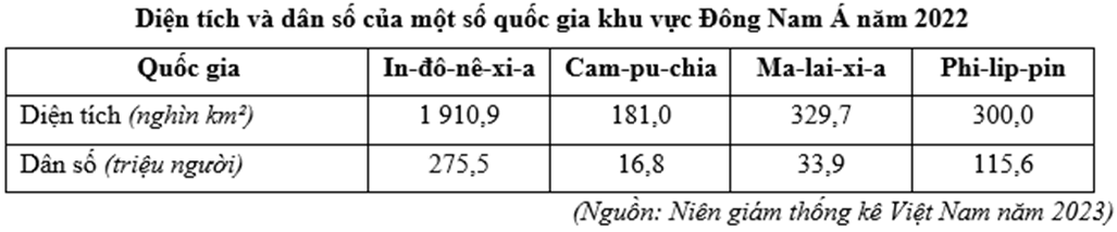 | c) Mật độ dân số của các nước xếp theo thứ tự từ thấp lên cao lần lượt là Cam-pu-chia, Ma-lai-xi-a, In-đô-nê-xi-a, Phi-lip-pin. | ||