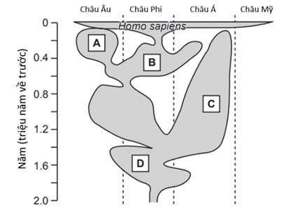 Dùng thông tin sau để trả lời 2 câu hỏi tiếp theo: Việc nghiên cứu hóa thạch đã cung cấp bằng chứng cho sự tiến hóa của con người hiện đại (Homo sapiens). Sơ đồ cho thấy mối quan hệ của bốn loài A–D, những loài này có họ hàng gần gũi của con người hiện đại. Đồng thời, sơ đồ chỉ ra vị trí tìm thấy hóa thạch và thời gian mà các sinh vật này sống.