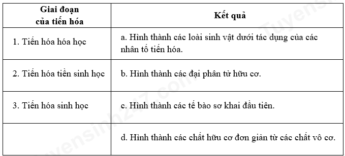 Ý nào sau đây ghép nối đúng trình tự các giai đoạn tiến hóa và kết quả của nó?