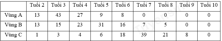 Khi đánh bắt ngẫu nhiên một loài cá ở ba vùng khác nhau người ta thống kê được tỉ lệ (%) các loại cá theo độ tuổi (tính theo năm) ở từng vùng như sau: