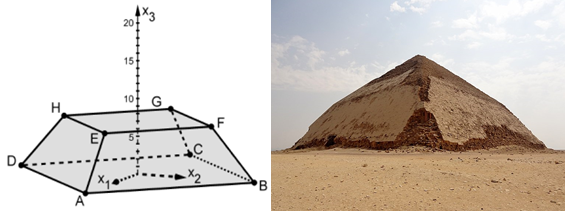 Kim tự tháp Bent còn có tên là Kim Tự Tháp cong, được xây dựng ở Dahshur vào khoảng năm 2600 TCN. Gắn hệ trục tọa độ cho kim tự tháp này, với mặt phẳng \(Oxy\) là mặt đất, mỗi đơn vị độ dài trong hệ tọa độ tương ứng với 7 mét trong thực tế. Khối \({S_{15}}ABCD.EFGH\) chính là mô hình toán học của kim tự tháp Bent.