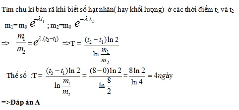 Để xác định chu kỳ bán rã T của một đồng vị phóng xạ, người ta thường đo khối lượng đồng vị phóng xạ đó trong mẫu chất khác nhau 8 ngày được các thông số đo là 8µg và 2µg.Tìm chu kỳ bán rã T của đồng vị đó?