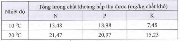 Thí nghiệm ảnh hưởng của nhiệt độ ở vùng rễ đến khả năng hấp thụ khoáng của cây dưa chuột (Cucumis sativus L.) được tiến hành và kết quả thí nghiệm này được trình bày ở bảng dưới đây.