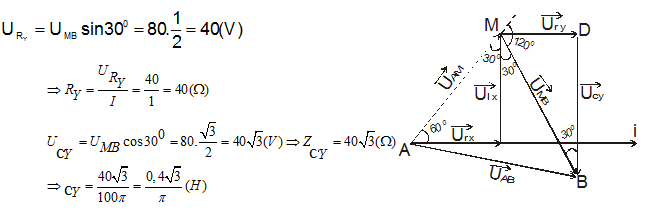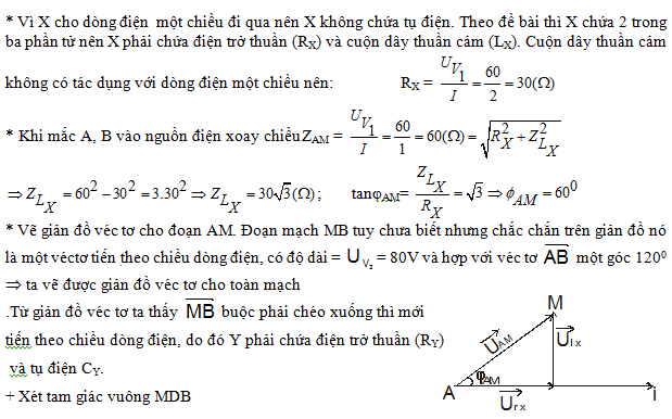 Cho hai hộp kín X, Y chỉ chứa 2 trong ba phần tử: R, L (thuần), C mắc nối tiếp. Khi mắc hai điểm A, M vào hai cực của một nguồn điện một chiều thì Ia = 2(A), UV1 = 60(V). Khi mắc hai điểm A, B vào hai cực của một nguồn điện xoay chiều tần số 50Hz thì Ia = 1(A), Uv1 = 60v; UV2 = 80V, UAM lệch pha so với UMB một góc 1200, xác định X, Y và các giá trị của chúng.