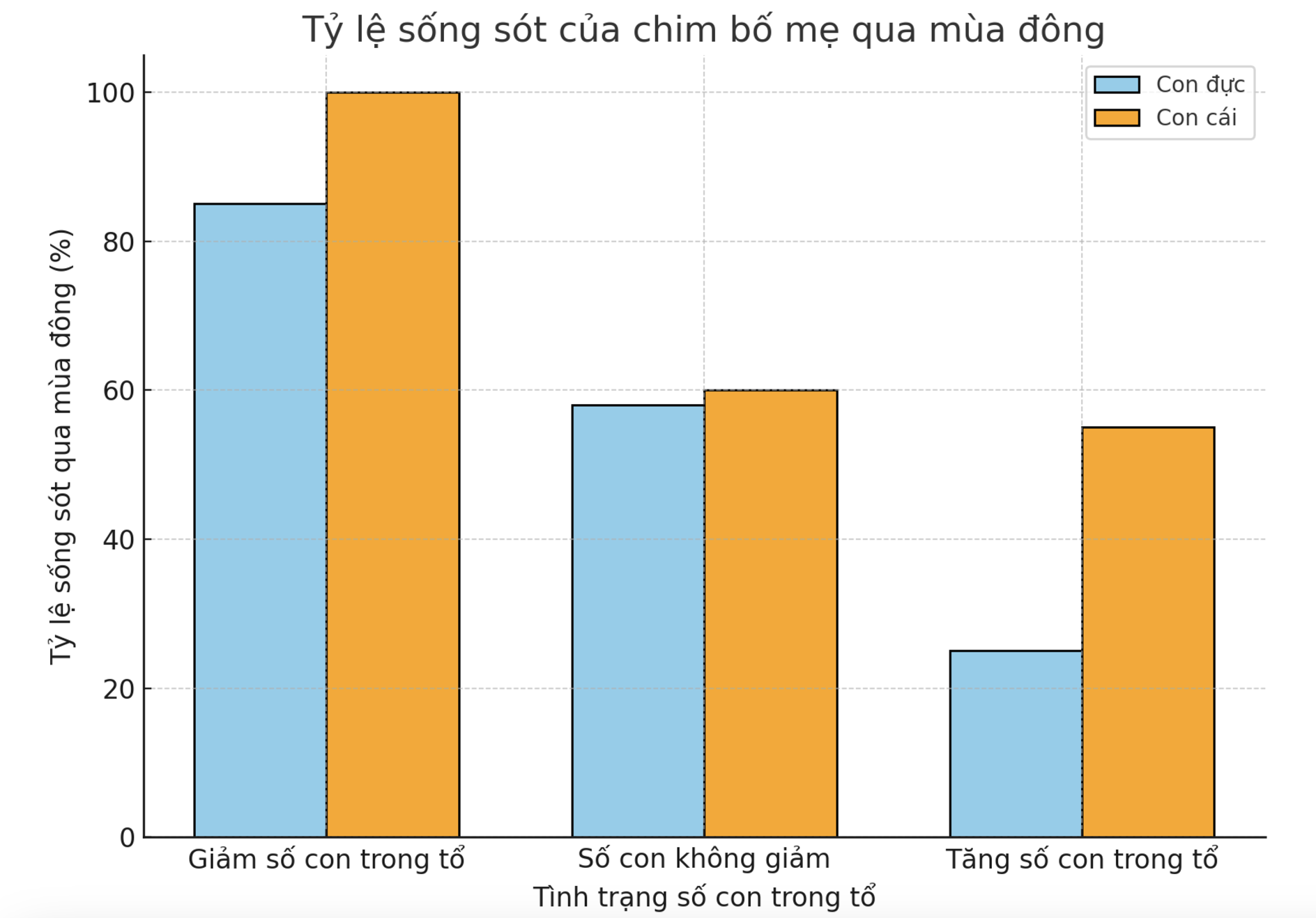 Cor Dijkstra và các cộng sự sau nhiều năm nghiên cứu về loài chim cắt châu Âu đã nhận thấy mức độ chăm sóc con cái có ảnh hưởng tới tỉ lệ sống sót của chim bố mẹ. Các nhà nghiên cứu đã lấy bớt hoặc bổ sung thêm số con non trong mỗi tổ và theo dõi số lượng chim bố mẹ sống sót qua mùa đông, kết quả thể hiện trong Hình bên. Phát biểu nào sau đây về thí nghiệm này là đúng?