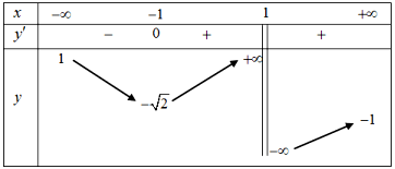Cho hàm số \(y=f(x)\) liên tục trên \(\mathbb{R} \backslash\{1\}\) có bảng biến thiên như hình vẽ.