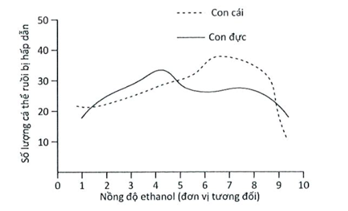 Ruồi quả thường tìm kiếm thức ăn bằng cách nhận biết mùi ethanol phát ra từ quả. Các quả cũng là địa điểm để ruồi đực và cái kết cặp sinh sản. Hình bên thể hiện mối quan hệ giữa số lượng ruồi bị hấp dẫn với nồng độ ethanol. Ruồi đực bị hấp dẫn nhất bởi nồng độ ethanol nào?