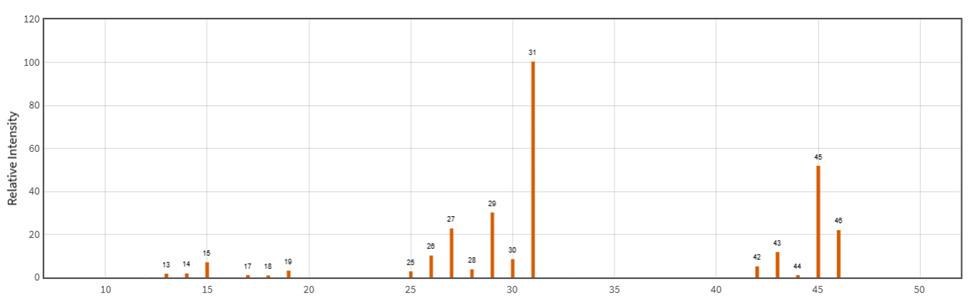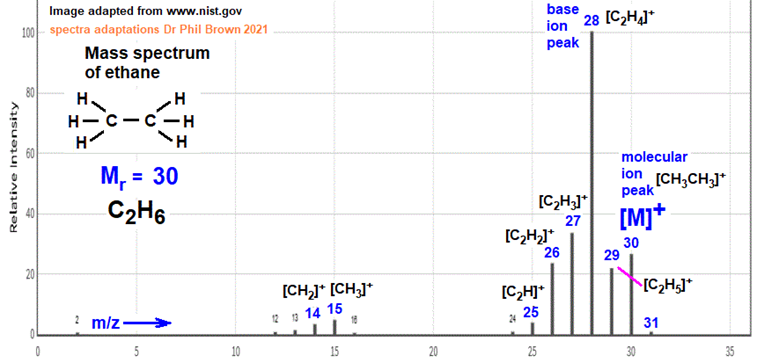 Ion phân tử và ion mảnh của ethane được ghi nhận và thể hiện qua phổ khối (MS) sau: