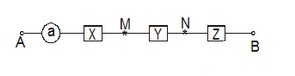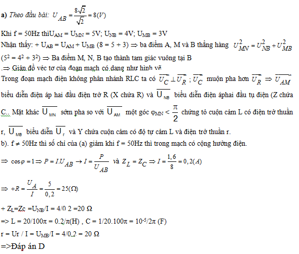 Cho mạch điện chứa ba linh kiện ghép nối tiếp: R, L (thuần) và C. Mỗi linh kiện chứa trong một hộp kín X, Y, Z. Đặt vào hai đầu A, B của mạch điện một điện ápxoay chiều u =8√2sin2πft (V). Khi f = 50Hz, dùng một vôn kế đo lần lượt được UAM = UMN = 5V, UNB = 4V; UMB = 3V. Dùng oát kế đo công suất mạch được P = 1,6W .Khi f ¹ 50Hz thì số chỉ của ampe kế giảm. Biết RA ≈ 0; RV ≈ ∞. Mỗi hộp kín X, Y, Z chứa linh kiện gì? Tìm giá trị của các linh kiện.
