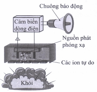 Hình bên dưới mô tả sơ đồ hoạt động đơn giản hoá của cảm biến báo khói ion hoá. Nguồn phóng xạ \(\alpha \) americium \({}_{95}^{241}Am\) có hằng số phóng xạ \(5,{081.10^{ - 11}}\,\,{s^{ - 1}}\) được đặt giữa hai bản kim loại kết nối với một pin. Các hạt \(\alpha \) phóng ra làm ion hoá không khí giữa hai bản kim loại, cho phép một dòng điện nhỏ chạy giữa hai bản kim loại đó và chuông báo không kêu.