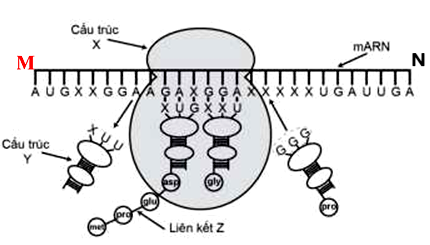 | a) Cấu trúc X được cấu tạo từ tRNA, liên kết Z là liên kết peptide. | ||