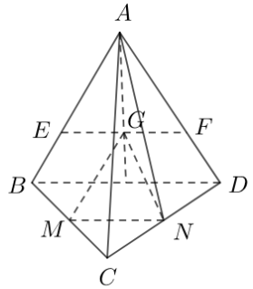 Cho hình tứ diện đều \(ABCD\) có độ dài cạnh bằng 6cm. Gọi \(M,\,\,N\) lần lượt là trung điểm cạnh \(BC,\,\,CD\) và \(G\) là trọng tâm của tam giác \(ABD\). Mặt phẳng \(\left( {GMN} \right)\) cắt các cạnh \(AB,\,\,AD\) tại \(E,\,\,F\). Độ dài đoạn thẳng \(EF\) bằng