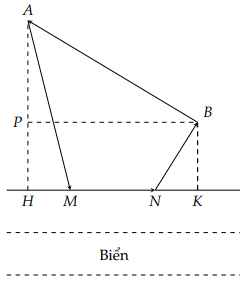 Gọi độ dài 1 đoạn là x, biểu diễn các độ dài quãng đường di chuyển theo x và khảo sát hàm số tìm GTNN.