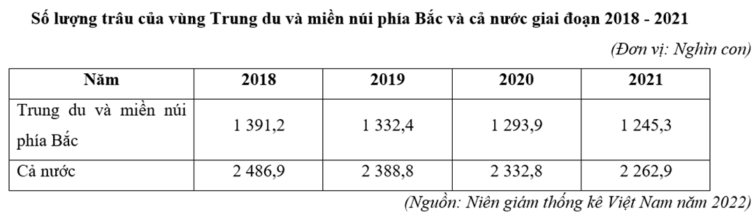 b) Dựa vào công thức: Tỉ trọng = (Giá trị thành phần/Tổng giá trị)*100. Sau đó tính tỉ trọng đàn trâu của vùng Trung du và miền núi phía Bắc so với cả nước của từng năm và rút ra nhận xét.