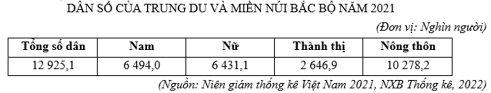 Căn cứ vào bảng số liệu trên, cho biết tỉ số giới tính của Trung du và miền núi Bắc Bộ năm 2021 là bao nhiêu nam/100 nữ? (làm tròn kết quả đến hàng đơn vị)