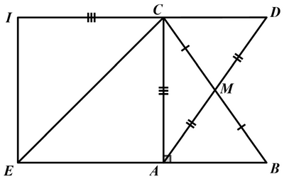 Cho \({\rm{\Delta }}ABC\) vuông tại \(A\), đường trung tuyến \(AM\). Trên tia đối của tia \(MA\) lấy điểm \(D\) sao cho \(DM = MA\).
