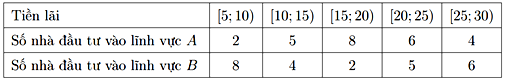 Người ta ghi lại tiền lãi (đơn vị: triệu đồng) của một số nhà đầu tư (với số tiền đầu tư như nhau), khi đầu tư vào hai lĩnh vực \(A,B\) cho kết quả như sau: