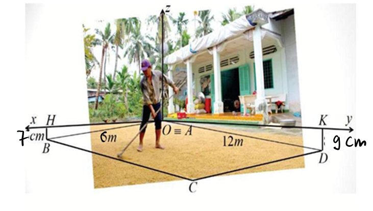 Ở một số vùng quê ở Việt Nam, trước mỗi nhà thường có một khoảng sân rộng để phơi lúa vào mùa gặt và cũng là nơi để tổ chức một số sự kiện: đám cưới, ám hỏi, thôi nôi,... Bác An tính xây một sân trước cửa nhà hình chữ nhật \(ABCD\) có độ dài các cạnh lần lượt là \(AB = 6{\rm{\;m}}\) và \(AD = 12{\rm{\;m}}\). Để tiện cho việc thoát nước khi trời mưa và khi rửa sân nên bác An xây vị trí \(B\) thấp hơn vị trí \(A\) là 7 cm , vị trí \(D\) thấp hơn vị trí \(A\) là 9 cm. Chọn hệ trục tọa độ \(Oxyz\) như hình vẽ để xác định xem vị trí \(C\) thấp hơn vị trí \(A\) _______ cm? (làm tròn đến cm ).