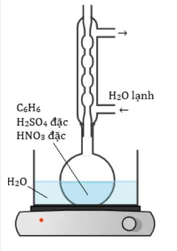 Bước 1: Cho con từ vào bình cầu dung tích 250 mL, thêm khoảng 30 mL H2SO4 đặc, làm lạnh trong chậu nước đá rồi thêm từ từ vào khoảng 30 mL HNO3, sau đó thêm tiếp khoảng 10 mL benzene và lắp sinh hàn hồi lưu. Đun cách thủy hỗn hợp phản ứng trên bếp từ đến 80oC trong khoảng 60 phút.