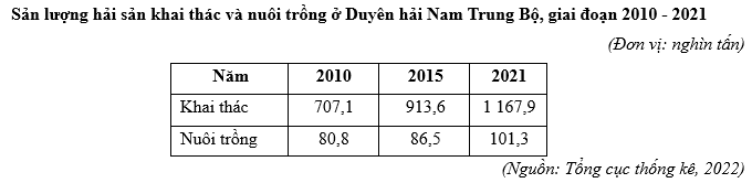 Cho bảng số liệu:Để thể hiện sản lượng hải sản khai thác và nuôi trồng ở Duyên hải Nam
