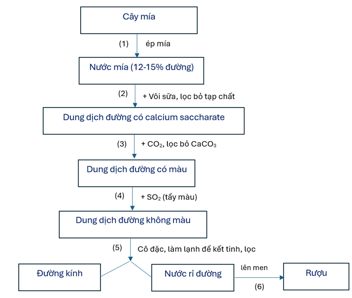 Sản xuất đường kính từ cây mía qua một số giai đoạn chính thể hiện ở sơ đồ dưới đây: