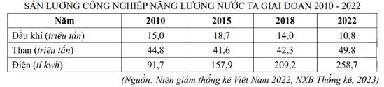 Dựa vào số liệu về sản lượng dầu khí, than, điện trong bảng số liệu và lựa chọn nhận xét đúng về sự tăng/giảm.