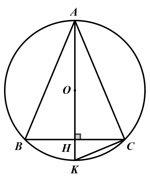 Cho tam giác \(ABC\) cân tại \(A\) nội tiếp đường tròn \((O;R)\). Kẻ đường cao \(AH\) cắt đường tròn \((O)\) tại \(K.\)