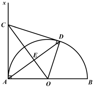 Cho nửa đường tròn \((O;R)\) đường kính \(AB.\) Tiếp tuyến \(Ax\) tại \(A\) (\(Ax\) thuộc nửa mặt phẳng chứa nửa đường tròn), lấy điểm \(C\) thuộc tia \(Ax.\) Từ \(C\) kẻ tiếp tuyến \(CD\) với nửa đường tròn \((O)\) tại \(D.\) \(AD\) giao \(OC\) tại \(E.\)