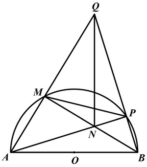 Cho nửa đường tròn \((O;R)\) đường kính \(AB\) và điểm \(M\) thuộc nửa đường tròn đó \((M\) khác \(A,B)\). Trên dây \(BM\) lấy điểm \(N\,\,(N\) khác \(B\) và \(M)\), tia \(AN\) cắt nửa đường tròn \((O)\) tại điểm thứ hai là \(P\). Tia \(AM\) và tia \(BP\) cắt nhau tại \(Q\).