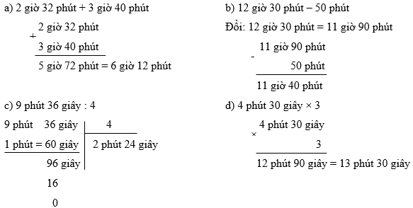 Đặt tính rồi tính:a) 2 giờ 32 phút + 3 giờ 40 phútb) 12 giờ 30 phút – 50 phútc) 9 phút 36 giây : 4
