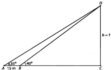 Để đo chiều cao của một tòa nhà, người ta chọn hai điểm \(A\) và \(B\) thẳng hàng với chân \(C\) của tòa nhà, cách nhau 15 m. Sử dụng giác kế, từ \(A\) và \(B\) tương ứng nhìn thấy đỉnh \(D\) của tòa nhà dưới các góc \({35^0}\) và \({40^0}\) so với phương nằm ngang. Hỏi chiều cao của tòa nhà đo được là bao nhiêu mét? (làm tròn kết quả đến hàng phần trăm).