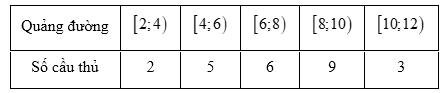 Quãng đường ( \(km\) ) các cầu thủ (không tính thủ môn) chạy trong một trận bóng đá tại giải ngoại hạng Anh được cho trong bảng thống kê sau: